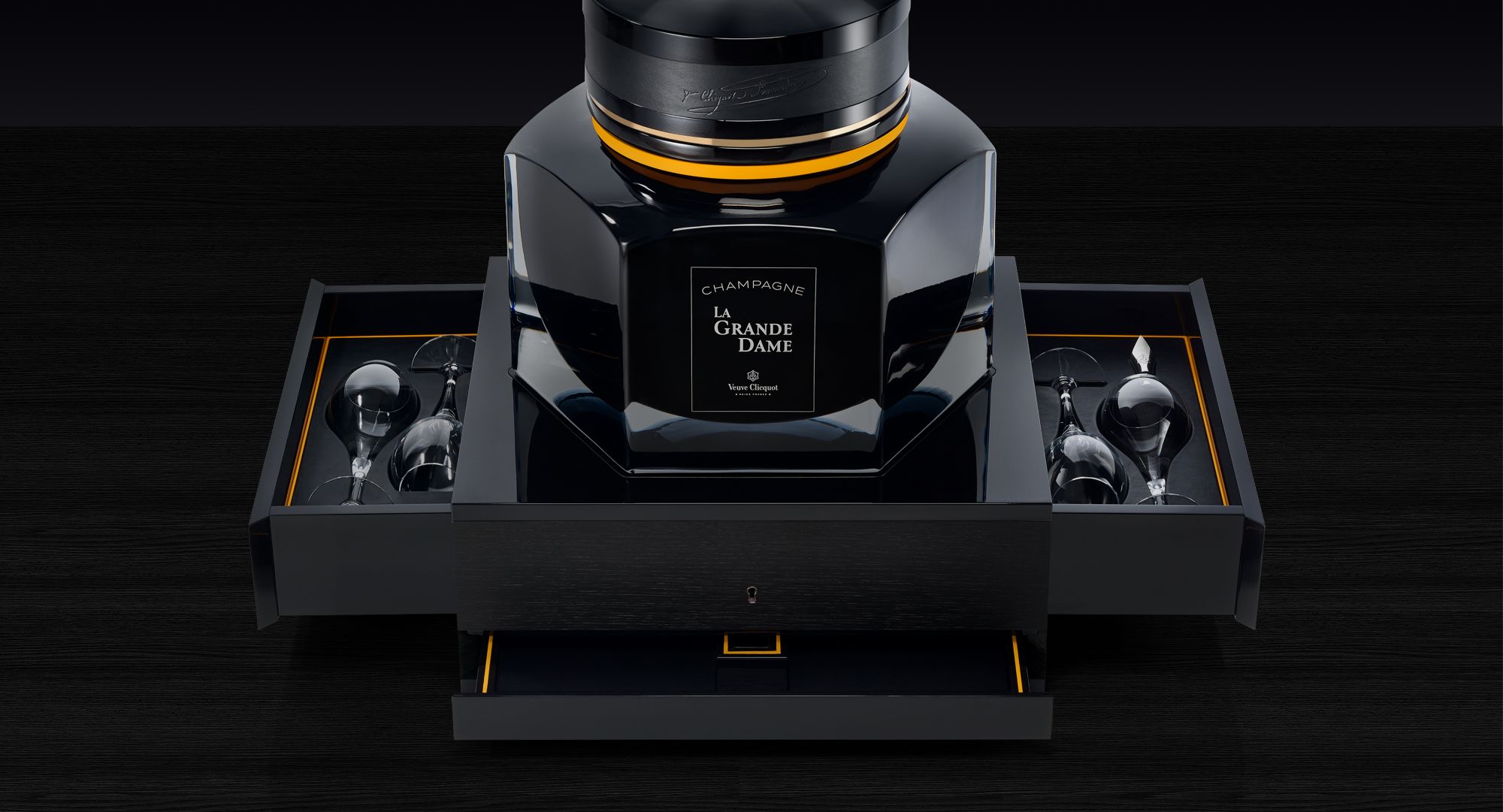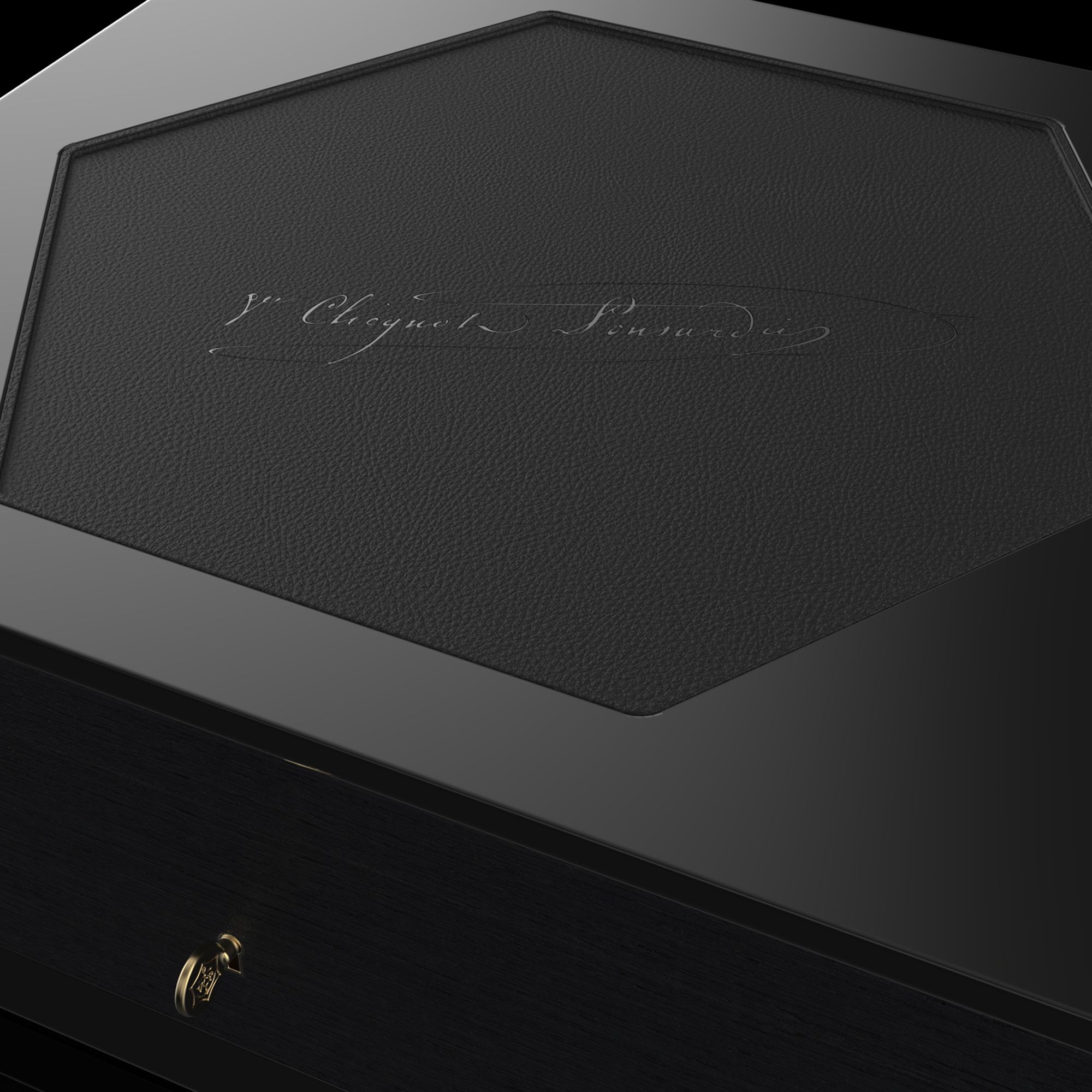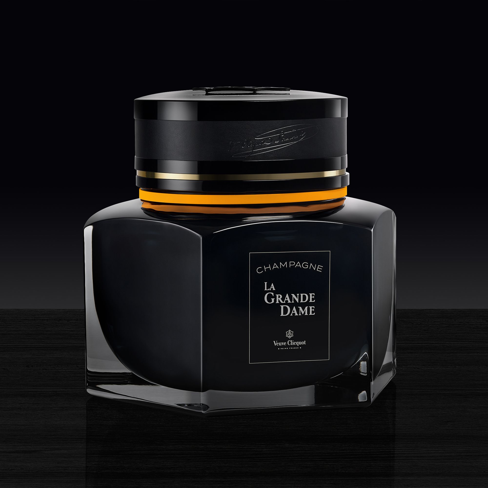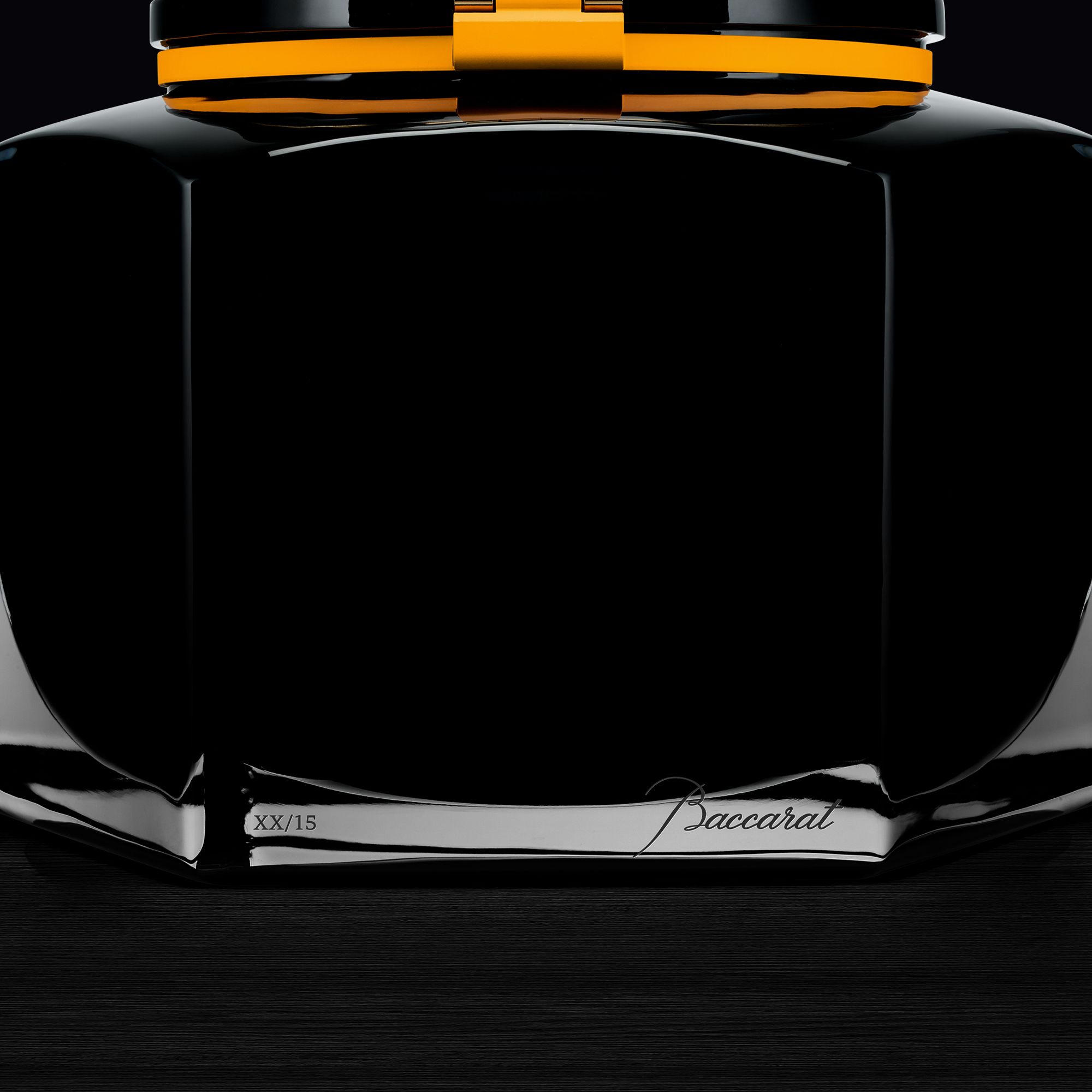 Un encrier réinventé en seau à champagne de cristal : une prouesse technique signée et numérotée par Baccarat, reposant sur une écritoire contenant les éléments de service.