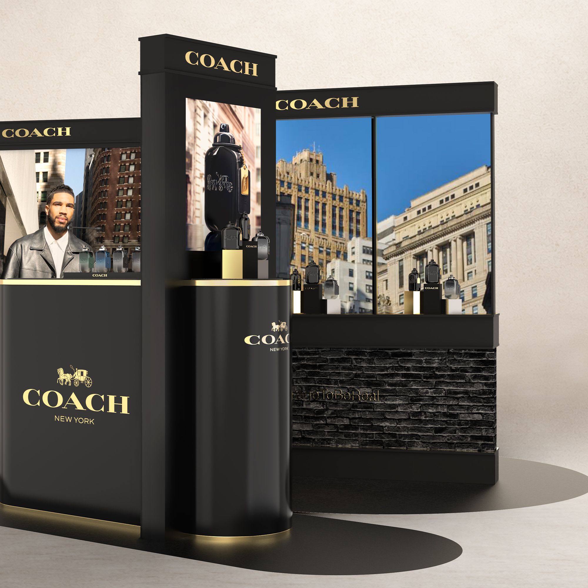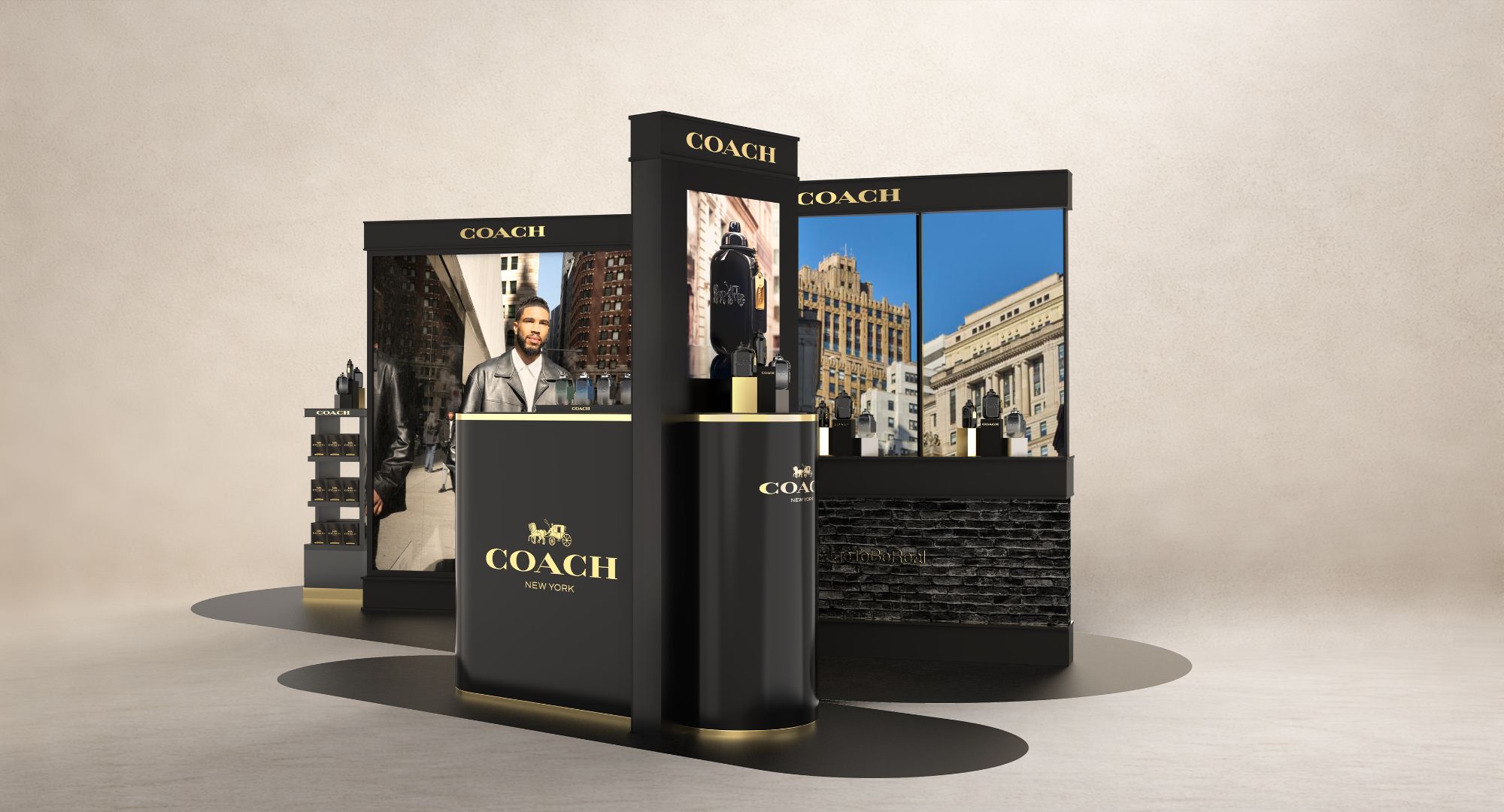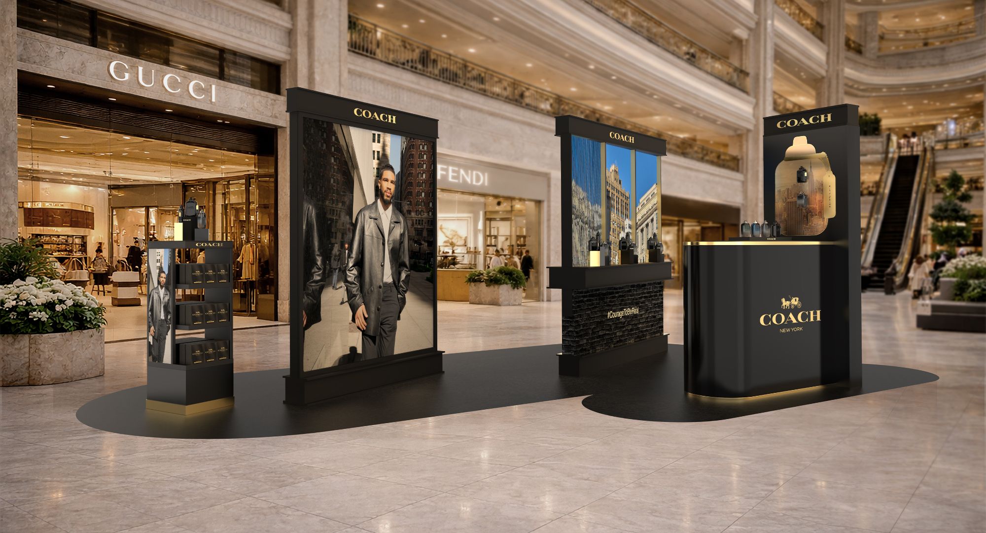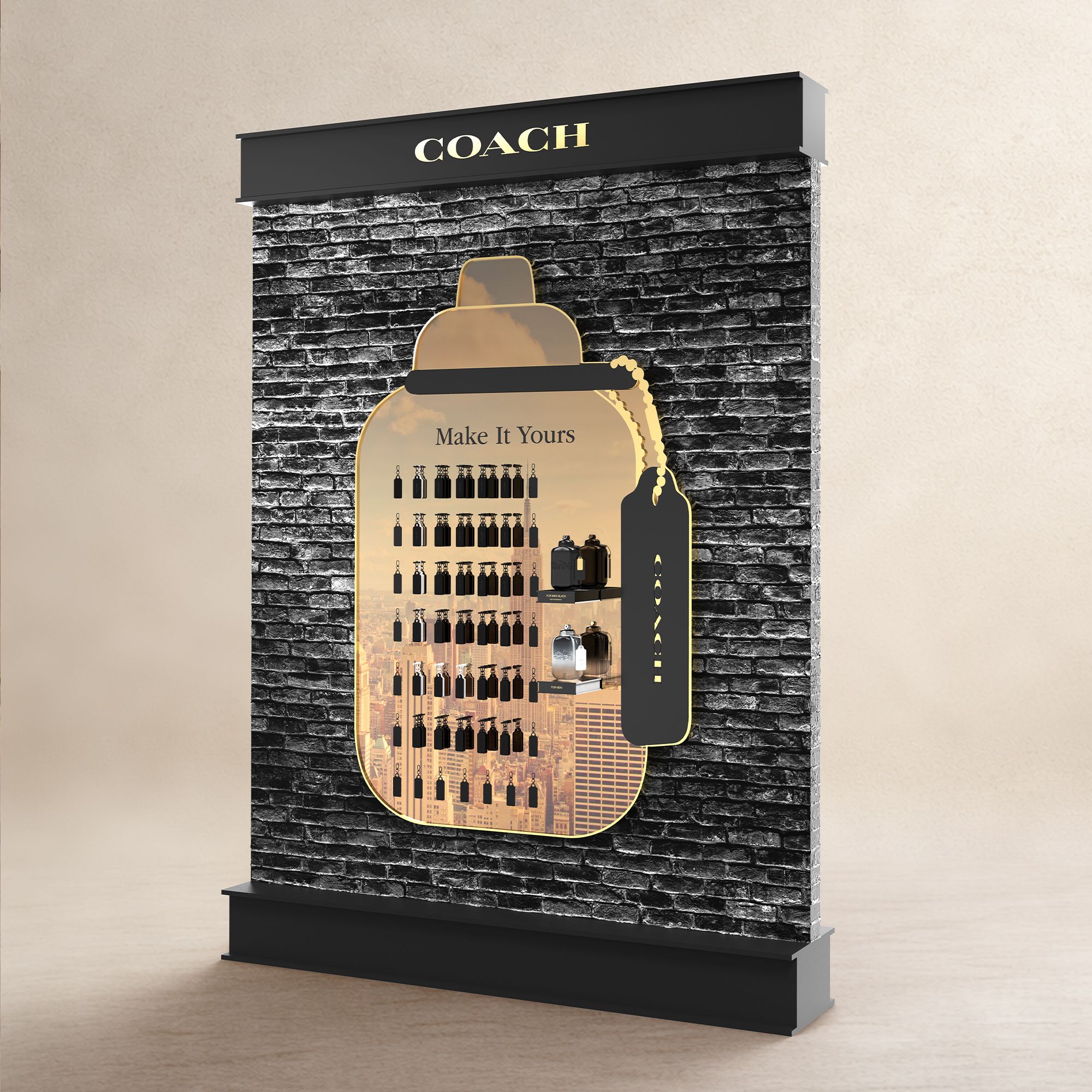 Concevoir un espace immersif dont l’esthétique et l’atmosphère traduisent l’identité du parfum : masculinité confiante et audacieuse, atmosphère urbaine et charisme.