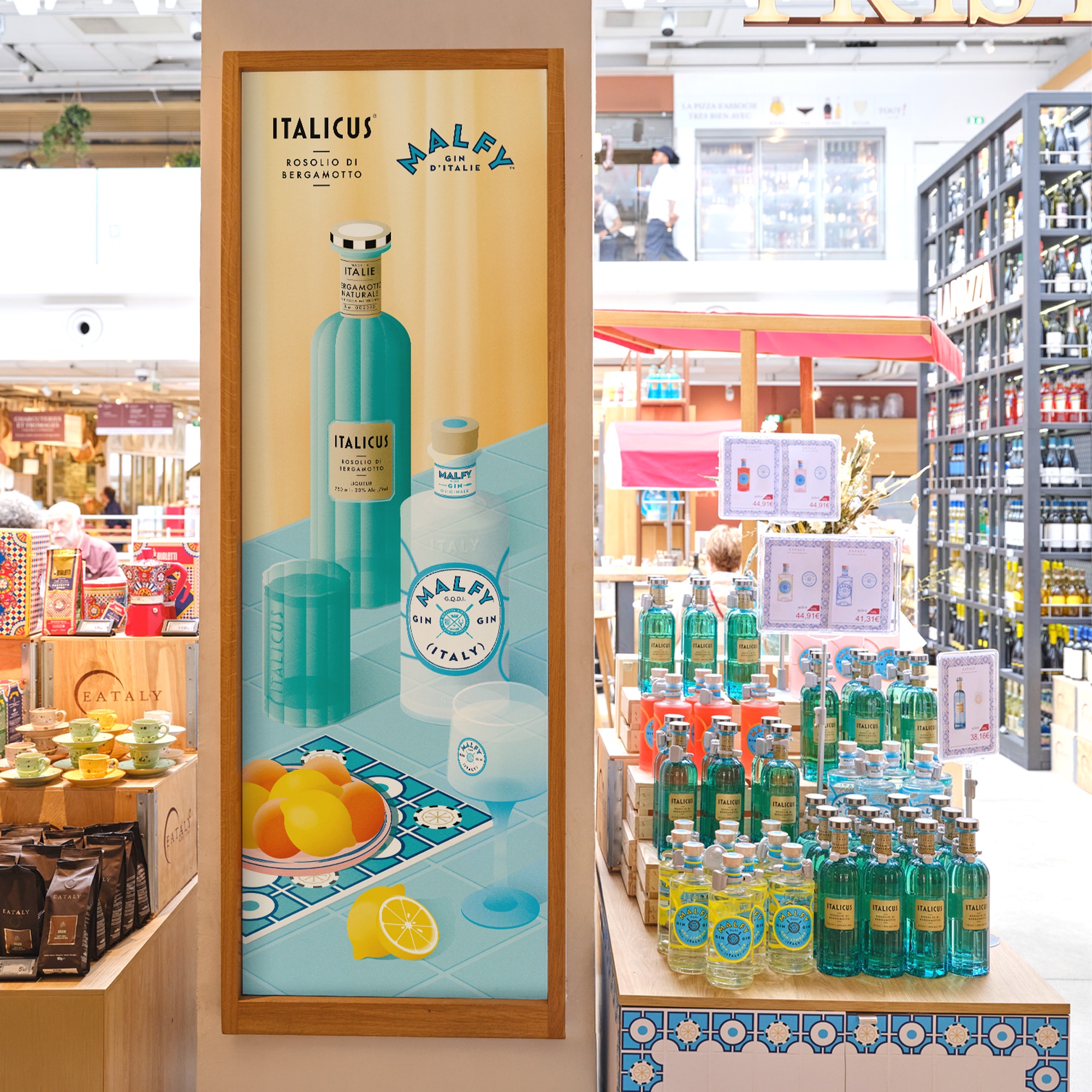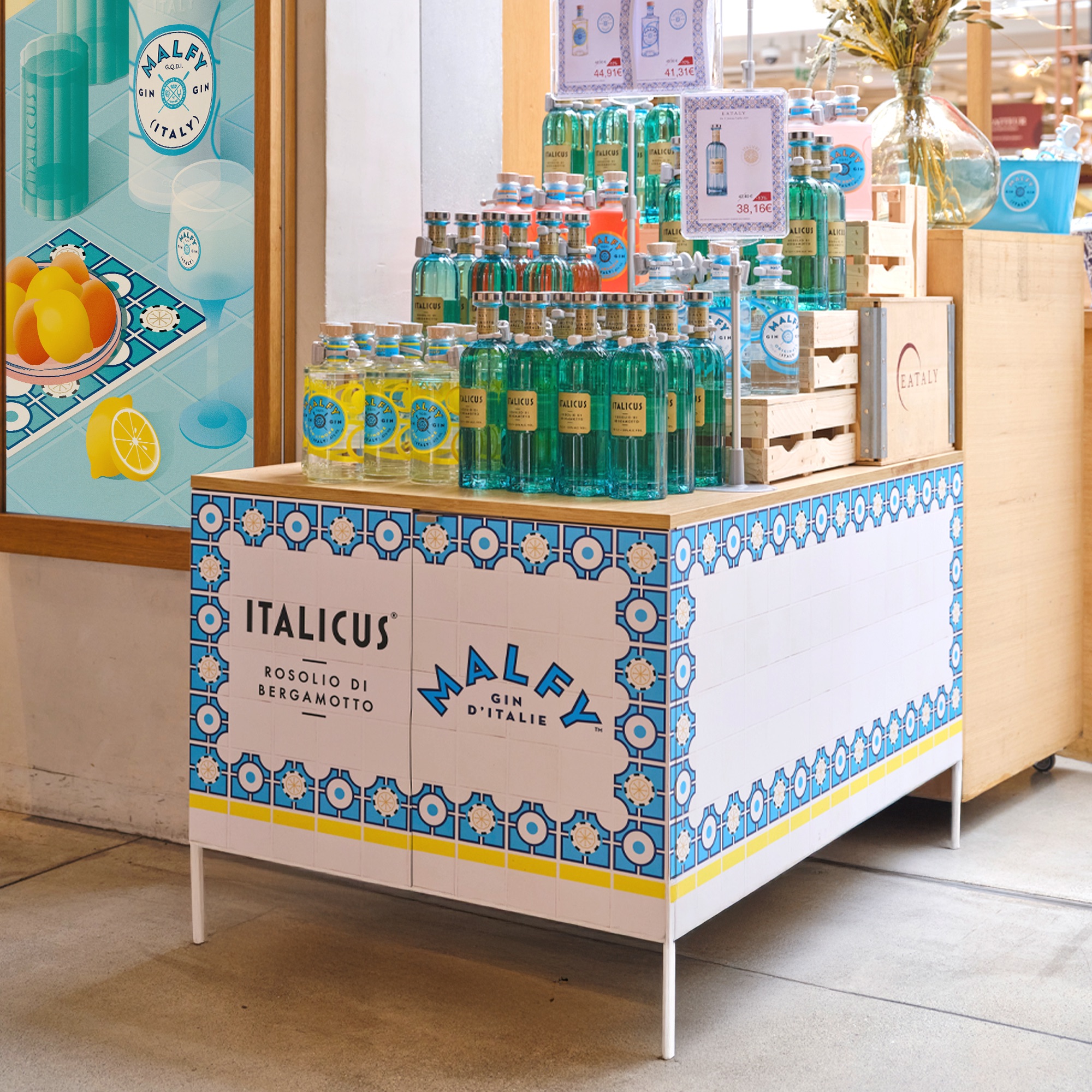 Les marques Italicus et Malfy s’invitent chez Eataly Paris. Les éléments de display ont vocation à allier l’univers des deux marques.