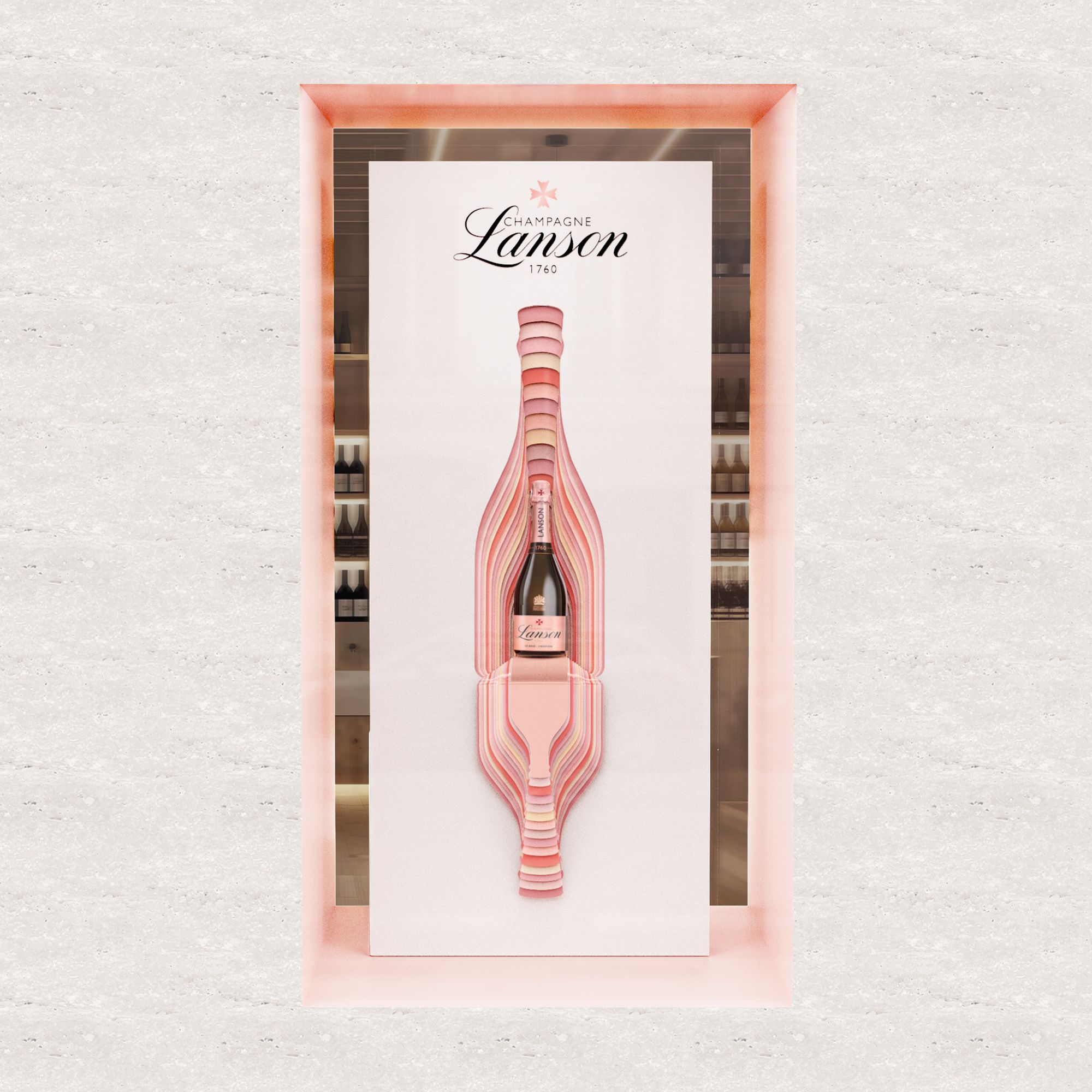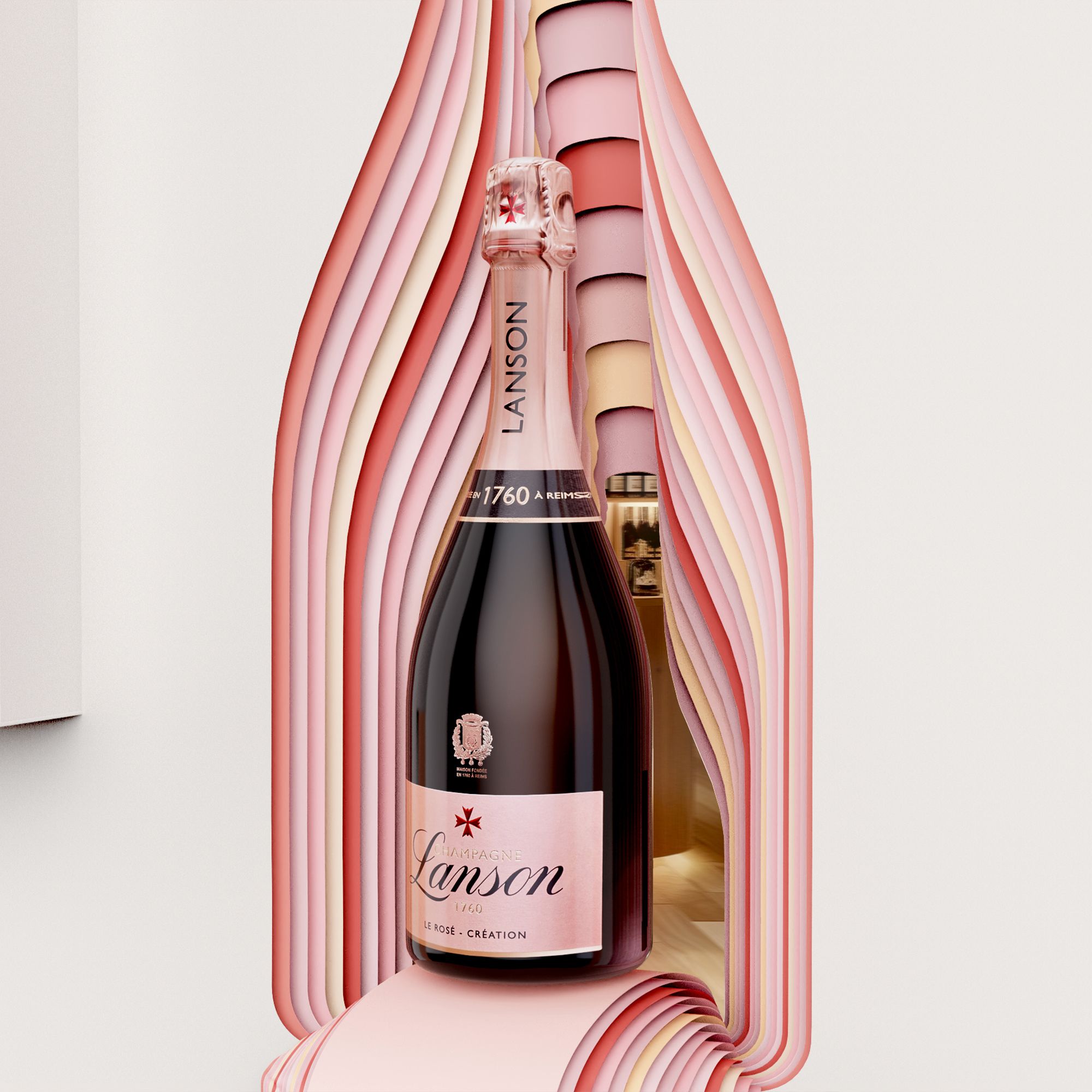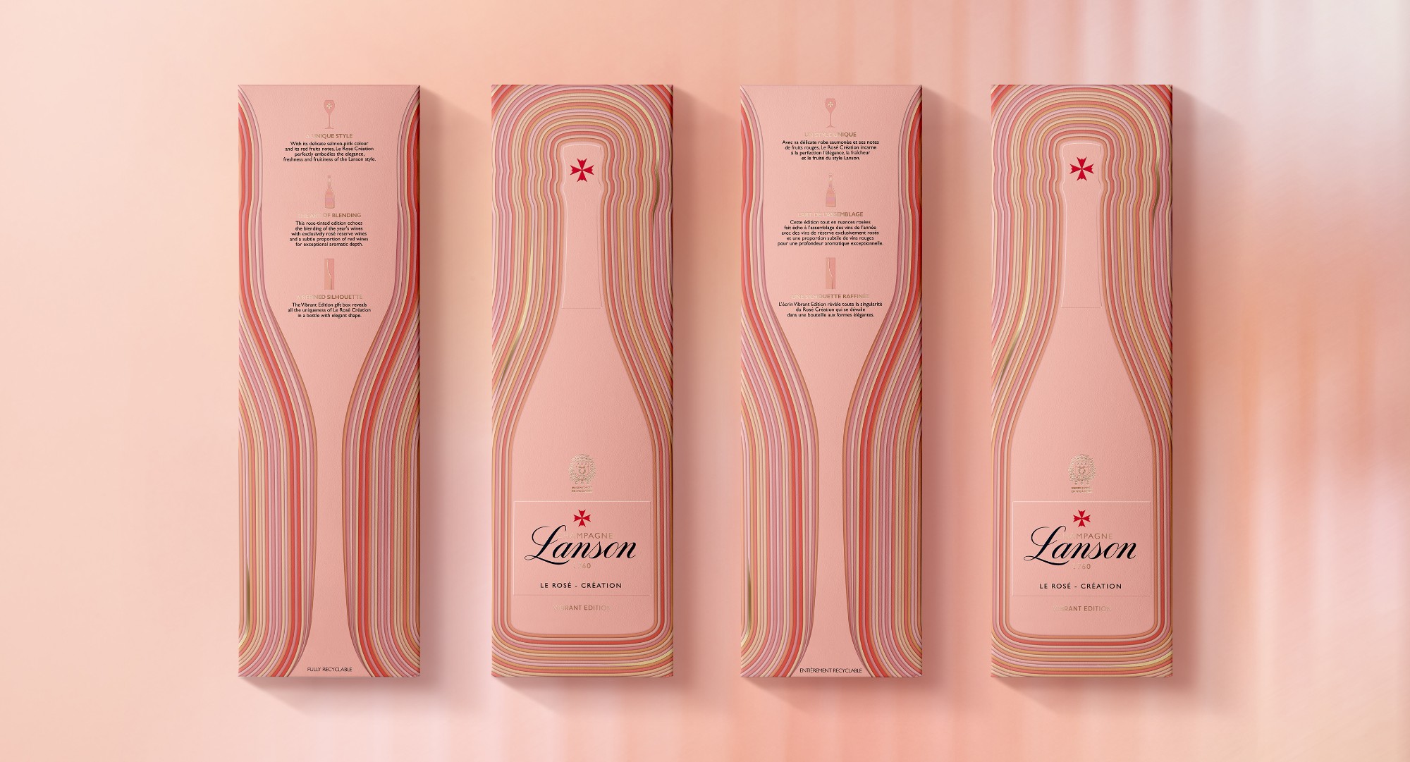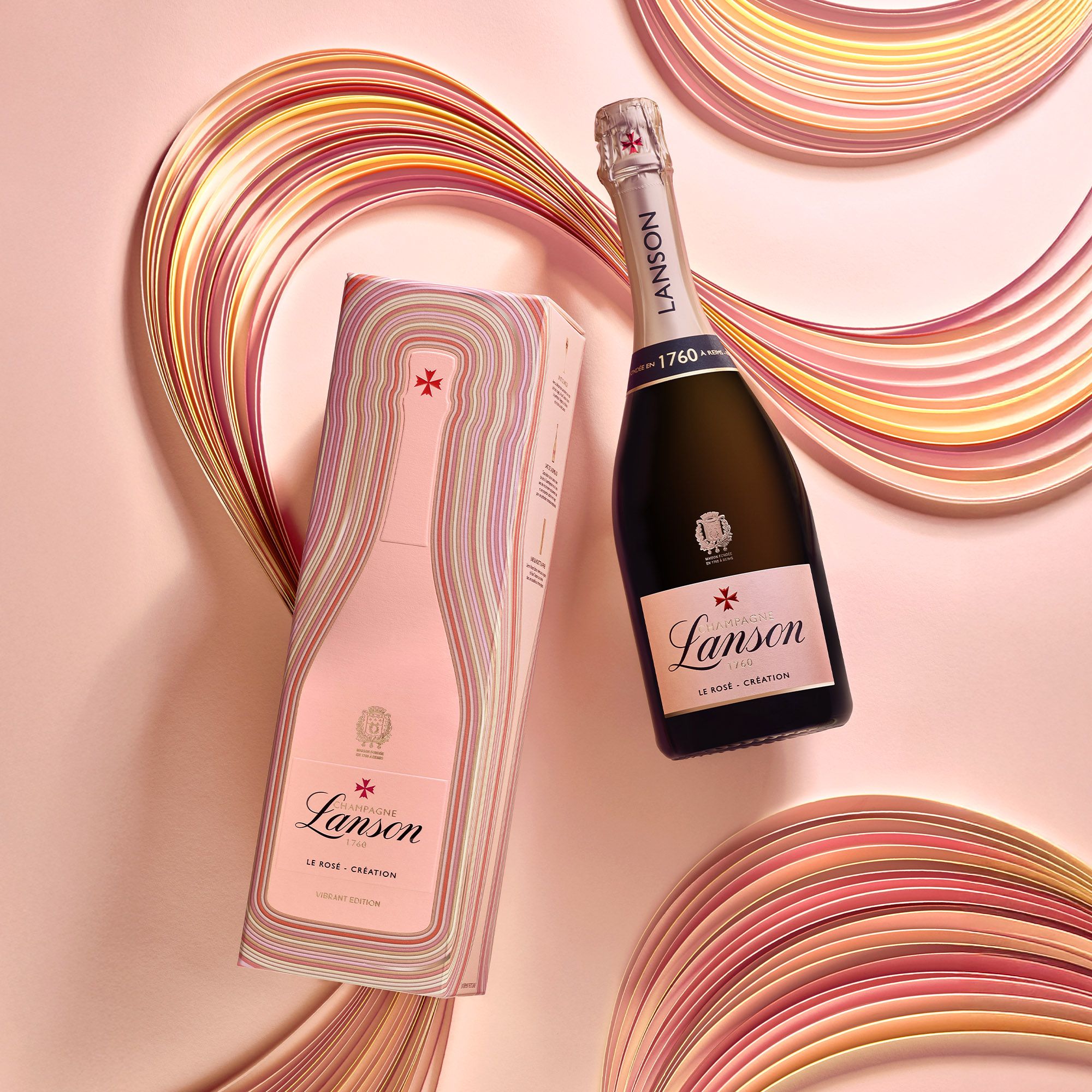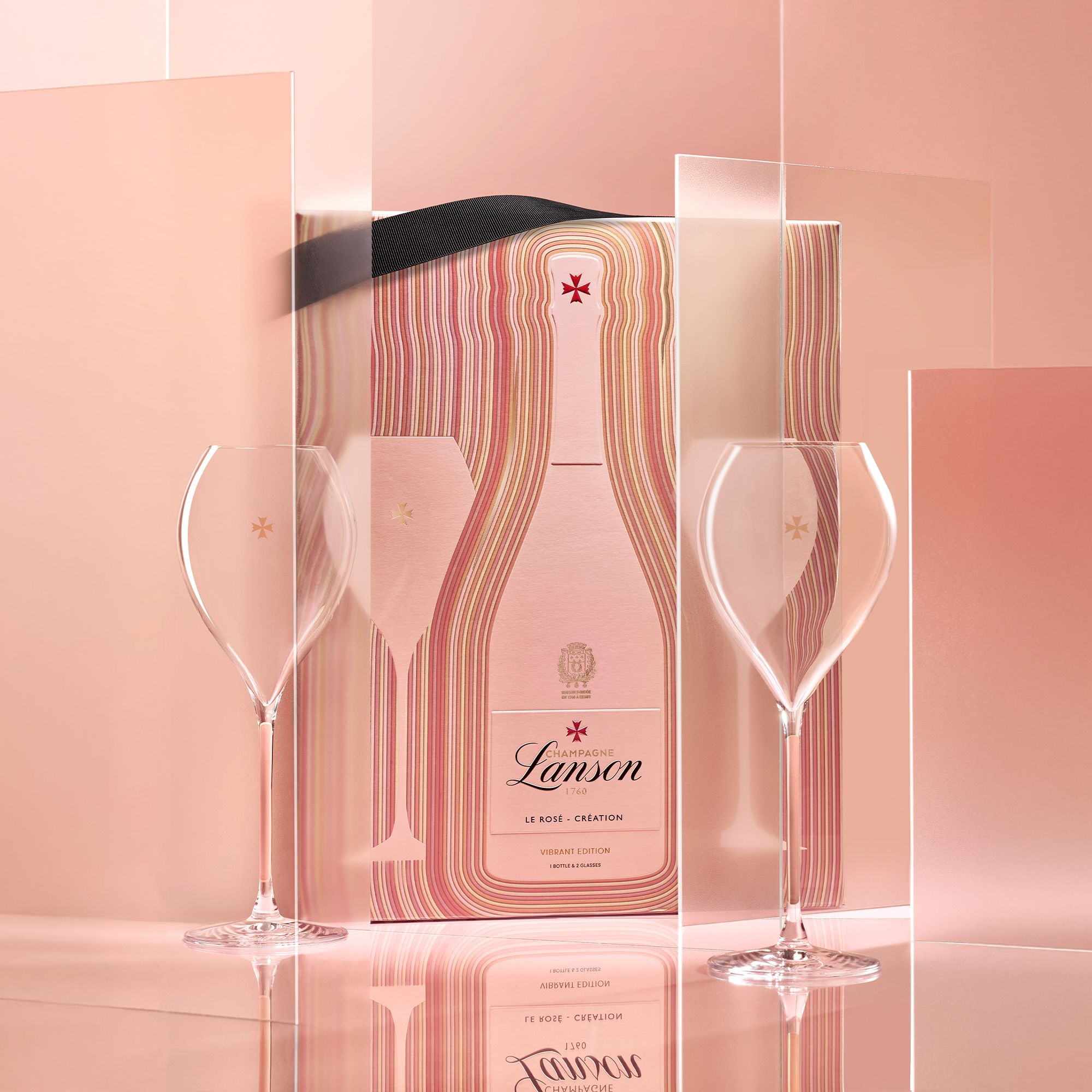 Une expression singulière où la silhouette iconique de la bouteille vibre d’une palette de nuances rosées. Un hommage à l’art de l’assemblage qui prend vie en étui événementiel, coffret et vitrines. © Nicolas Démoulin