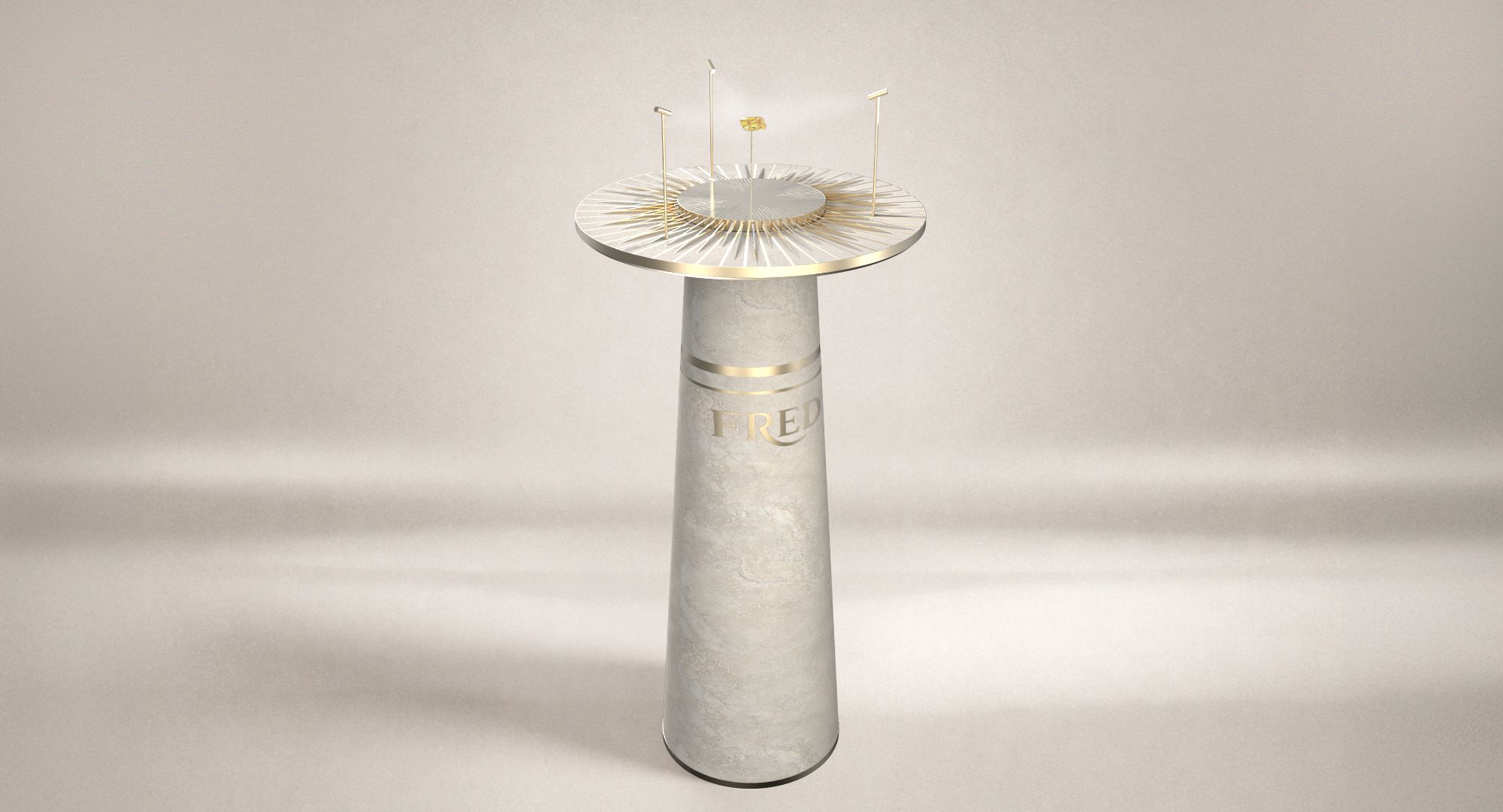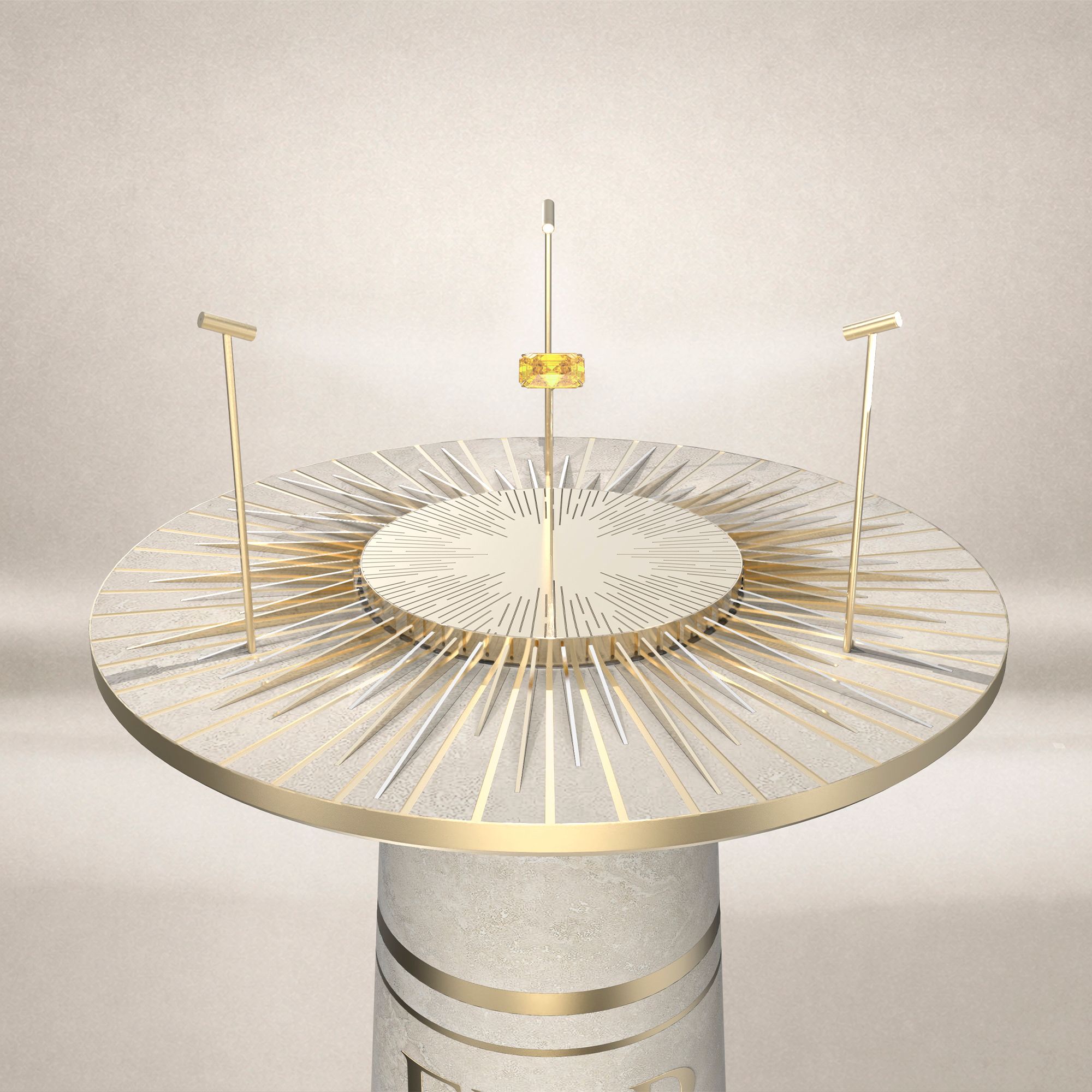 Casanova crée une stèle itinérante qui sublime la gemme en suspension. Ce display a été pensé comme un écho au soleil de la Riviera avec une approche disruptive permettant de sublimer le diamant jaune par des jeux de lumière.